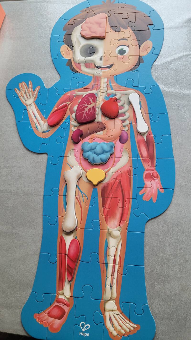 Le puzzle corps humain de 50 pièces et également accompagné de 10 pièces en bois 3D comprenant le cerveau, les poumons, le cœur, l'intestin grêle, la vessie, un rein, un biceps, un muscle du mollet, un humérus et un os du fémur. Idéal pour découvrir le corps de la tête au pied, il invite les enfants à comprendre les principes STEAM (Science, Technologie, Ingénierie, Art, Mathématiques). Il permet aux enfants de développer la coordination œil-main et de travailler la motricité fine.