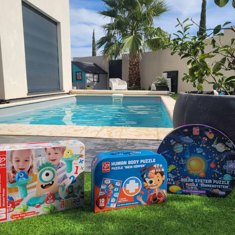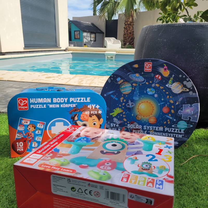 Le jeu que mes enfants ont préféré est le puzzle Système solaire. C'est un puzzle en bois 100 pièces, avec un soleil lumineux qui se place au centre et 8 planètes en bois qui se placent également sur le puzzle et peuvent tourner sur elles-mêmes. Les petits astronautes apprennent les noms et les positions des planètes tout en s'amusant ! Grâce à ce puzzle, les enfants font travailler leur motricité mais aussi leur mémoire ainsi que leur capacité organisationnelle.