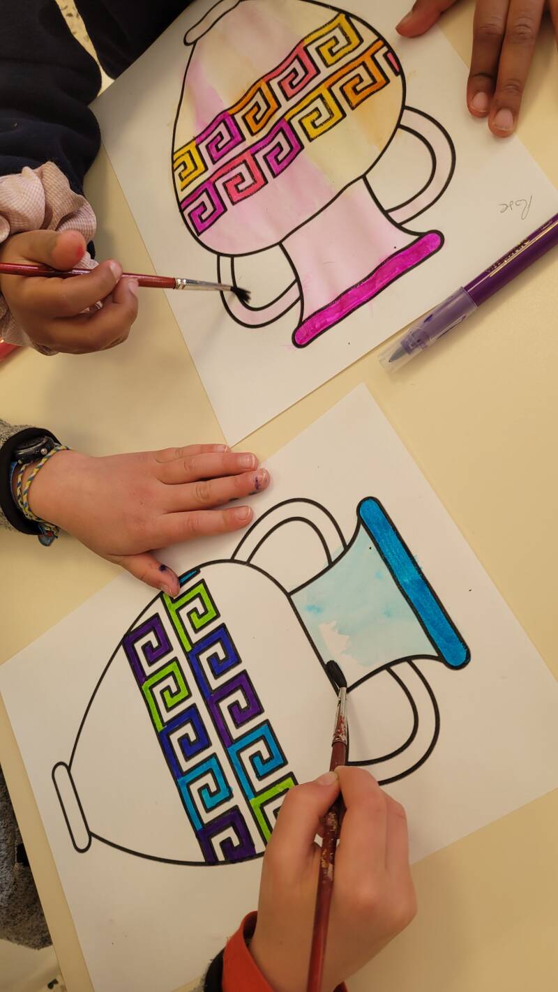 J’ai imprimé une amphore sur des feuilles cartonnées. Les élèves ont choisi d’utiliser des couleurs chaudes ou des couleurs froides. Nous avons utilisé les feutres VisaquarelleTM de la marque BIC @bic_groupe_france
